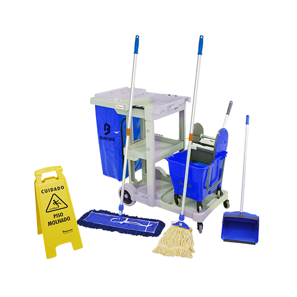 Primeiramente, o destaque do kit é o Carro Funcional América, que permite transportar com facilidade todos os acessórios e utensílios de limpeza necessários. Além disso, o balde Doblô de 30 litros com sistema de 2 águas possibilita a separação entre solução de limpeza e água limpa, otimizando o processo e evitando contaminação cruzada.